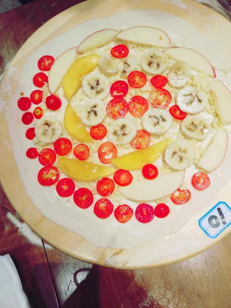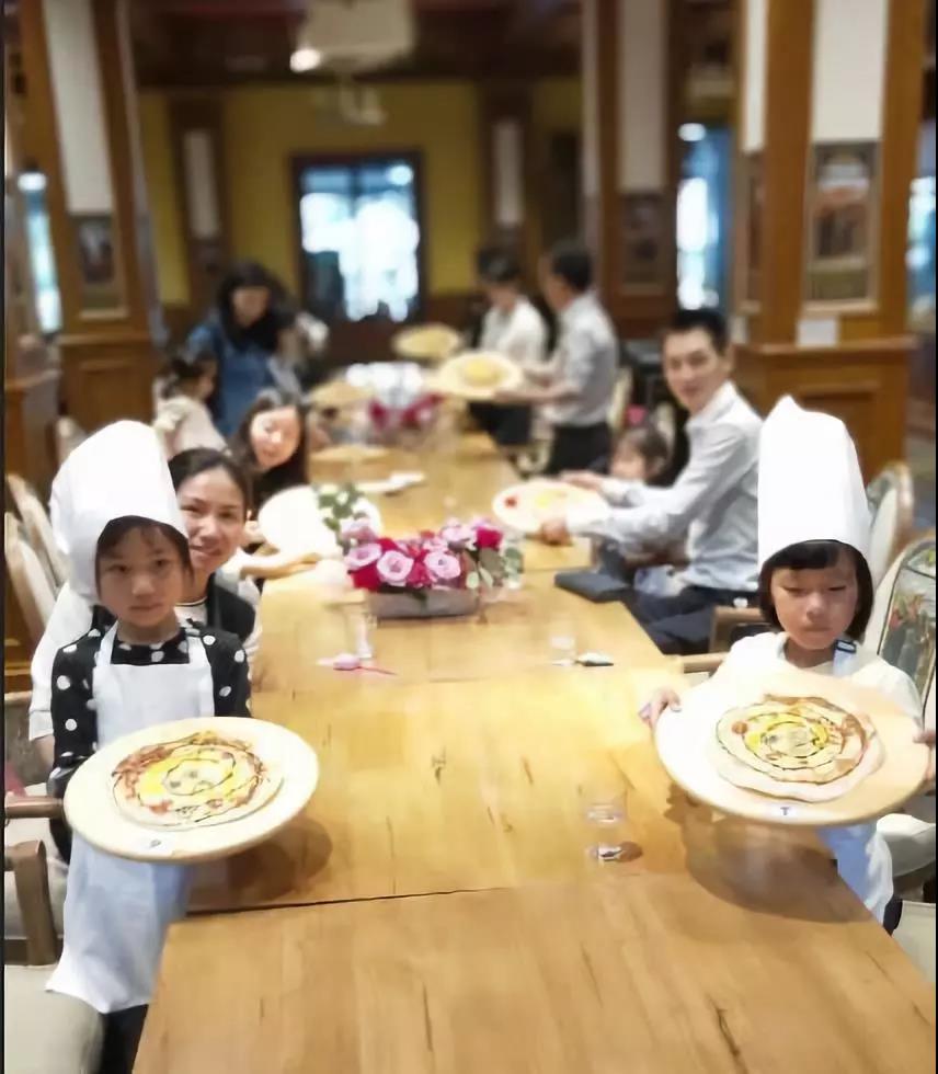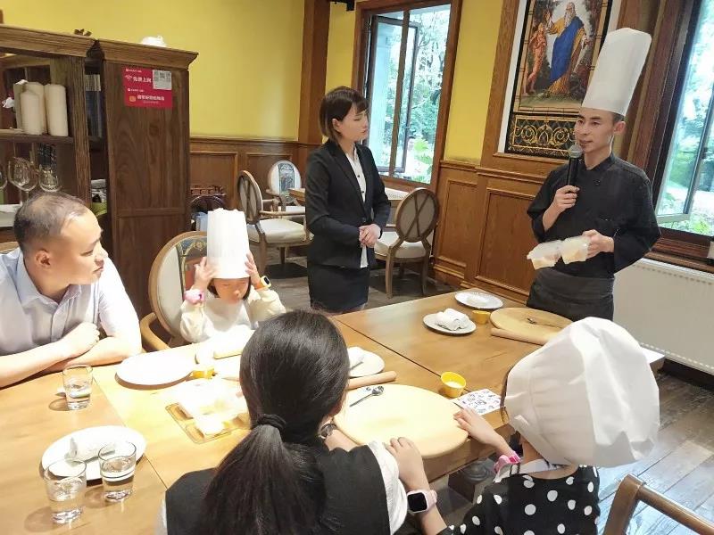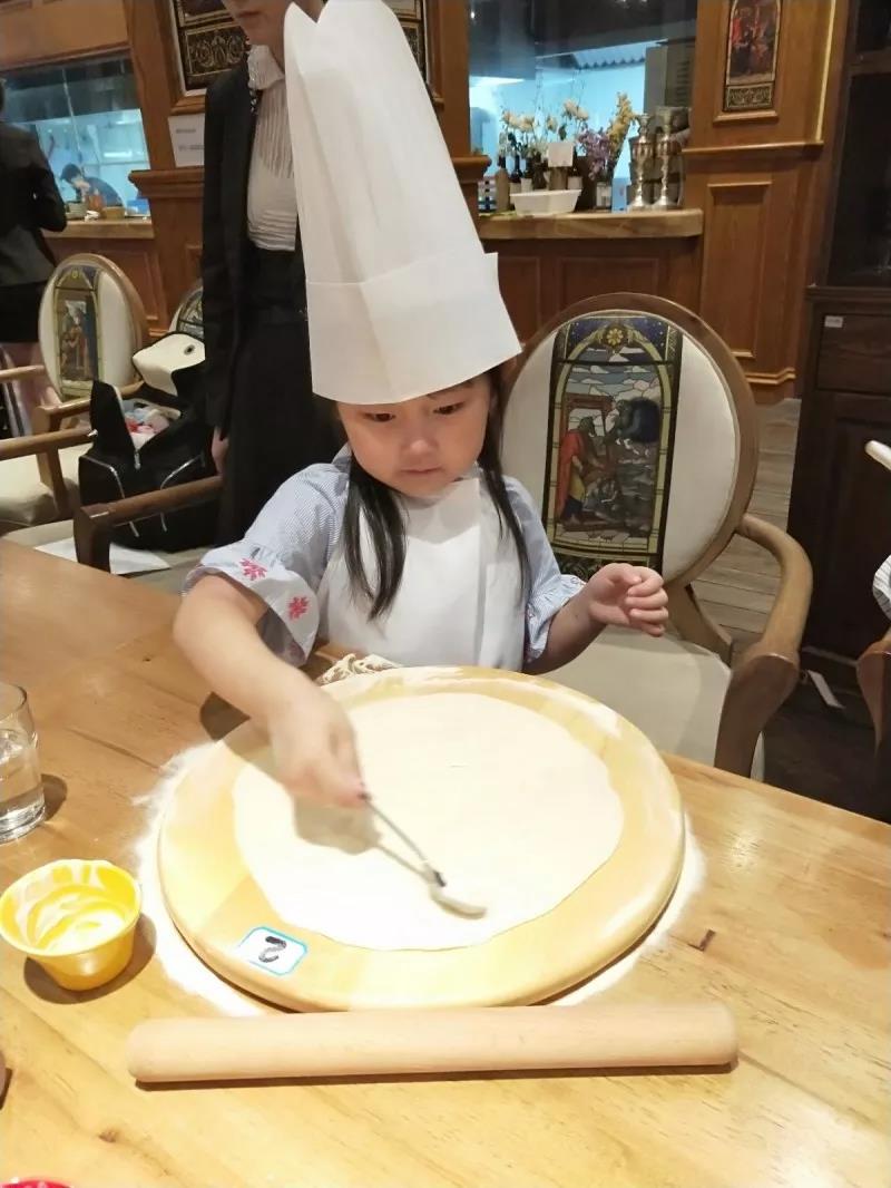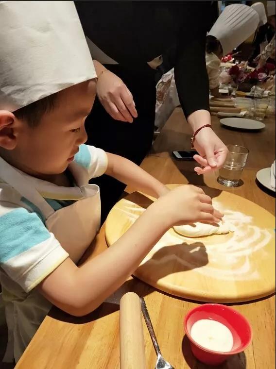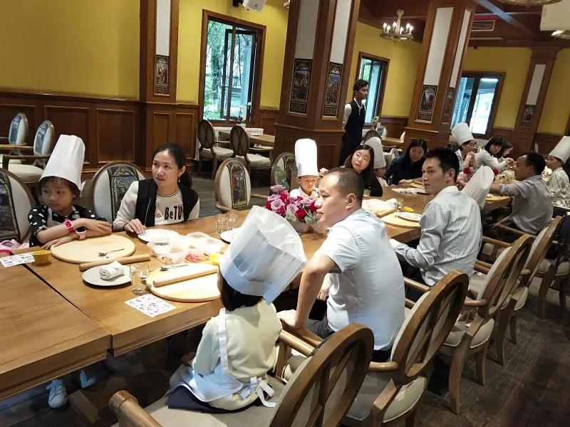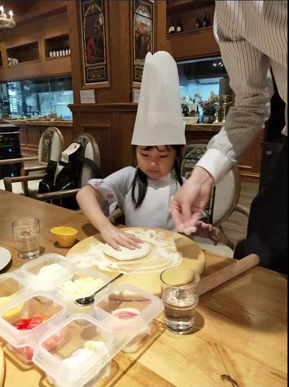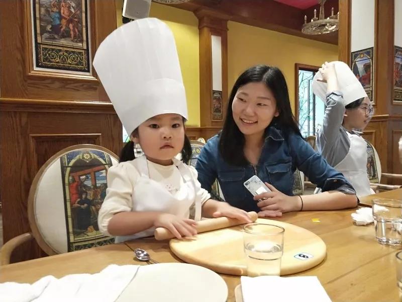 萌寶和爸爸媽媽專心聽老師講解如何做披薩